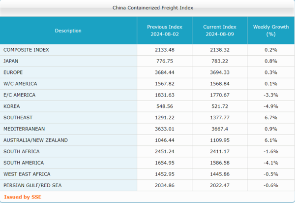 8월 2일 SCFI는 3332.67p로 전주대비 115.2p(3.34%) 내려, 3주 연속 하락세를 기록한 것으로 나타났다. CCFI도 하락세로 전환해 2일 전주보다 2.2% 하락한 2133.48p를 기록했다.