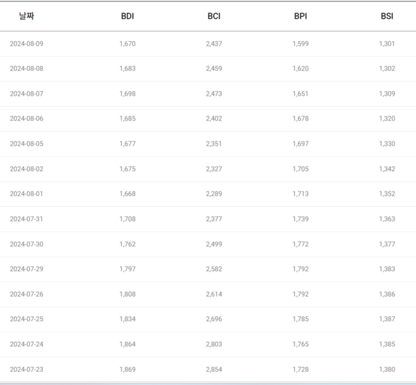 한편 건화물선운임지수 BDI는 반등 기회를 잡지 못하고 8월 9일 1670p를 기록했다. 전주(2일)보다 5포인트 하락했다.