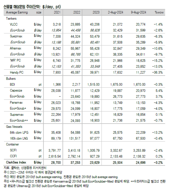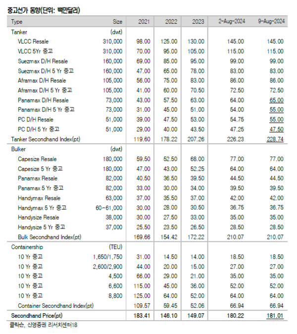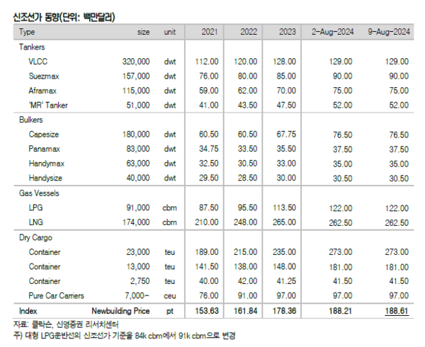 지난 주는 해상운임이 전반적으로 약세를 보였고, 신조선가와 중고선가지수는 모두 상승했다. 신영증권 엄경아 애널리스트에 따르면 올해 32주차(8월 9일) 신조선가지수는 0.4포인트 상승한 188.61p를 기록했다. 선종별 상세선가는 변동이 없었다.