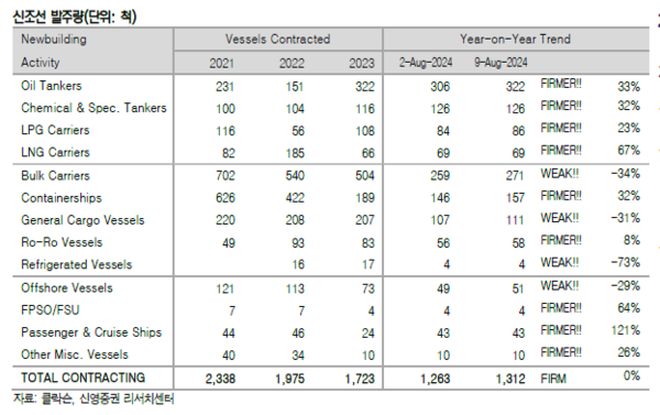 수주량은 오일탱커 16척, LPG선 2척, 드라이벌크선 12척, 컨테이너선 11척, 제너럴카고선 4척, 로로선 2척, 해양지원선 2척 등 총 49척을 기록했다. 32주차 누적수주량은 1,312척이며, 전년동기 누적수주량은 947척이었다.