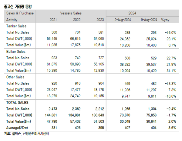 32주차 중고선 거래량은 39척을 기록했다. 누적기준으로는 1,304척이 거래됐으며, 전년동기는 1,336척을 기록했다.