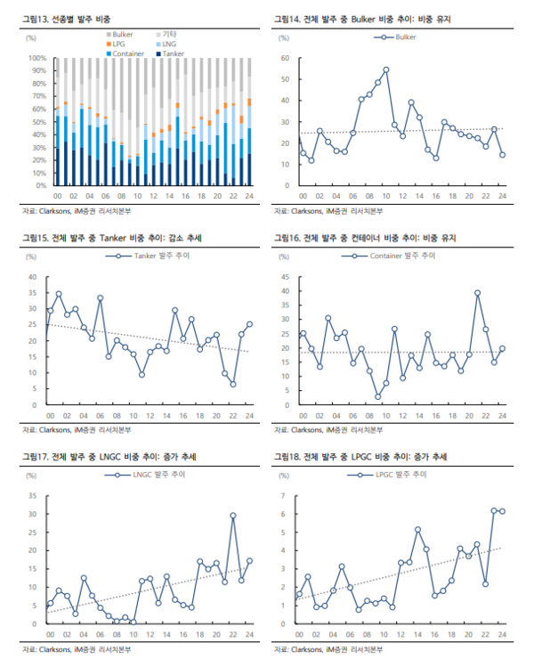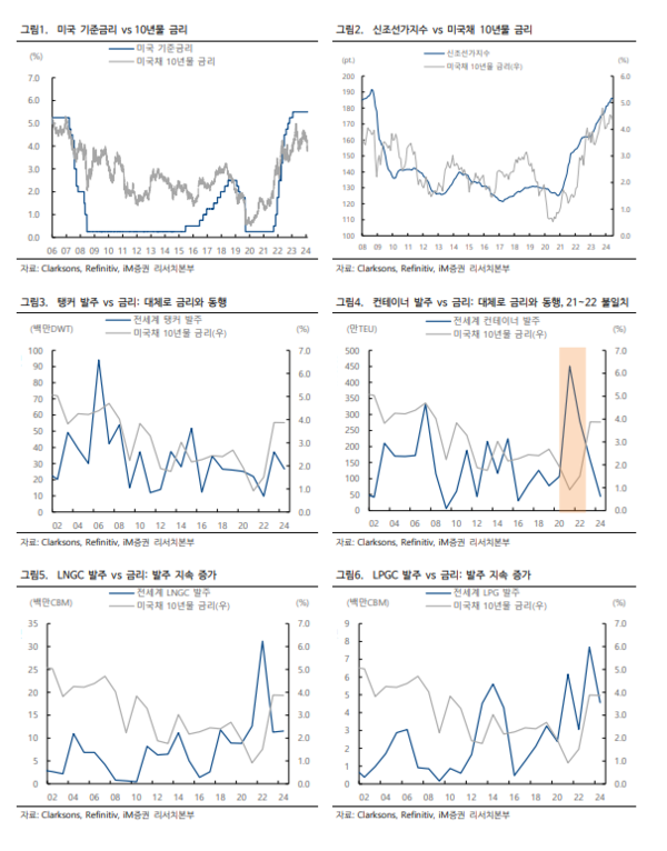선종별로 보면 가스선(LNG, LPG/암모니아)의 수요는 금리 하락에 상대적으로 크게 반응하지 않지만, 전세계 물동량을 반영하는 탱커와 컨테이너선 발주는 금리와 보다 밀접한 상관관계를 가진다. 선종별로 차이는 있지만 앞으로 모든 선종의 발주 증가를 말하기는 어려워졌다.