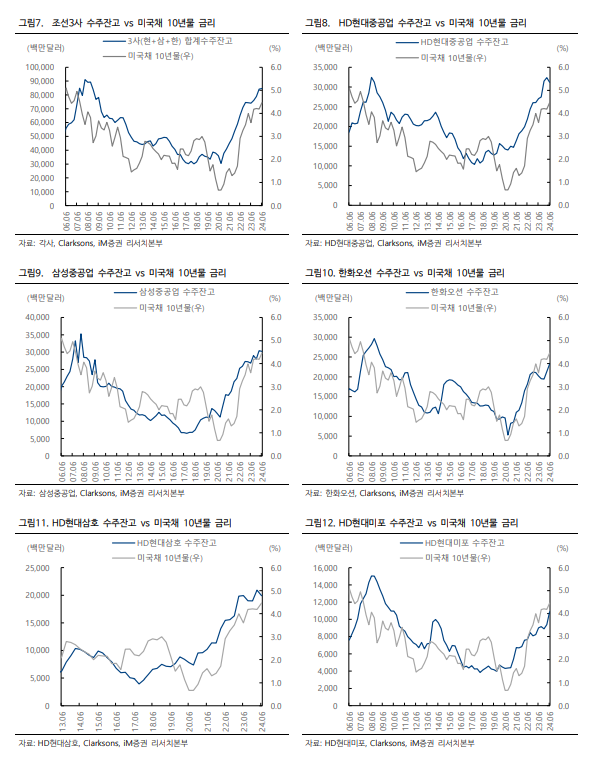 경기상황을 반영하는 시장금리는 신조선가지수와 강하게 동행하며, 신조선가지수는 다시 수주잔고와 강하게 동행한다. 즉 일반적으로, 금리 하락은 발주 하락과 신조선가 하락을 동반한다. 현재 조선3사의 상선 수주잔고는 846.3억 달러로 Peak였던 08년 2분기의 92.9% 수준이다.