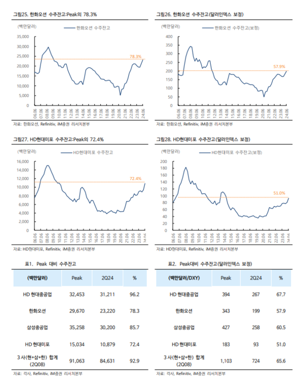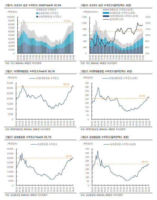 달러의 구매력을 감안해 달러 인덱스(DXY)로 보정해보면 수주잔고는 피크의 65.6%수준으로 아직 여력이 있다고 볼 수 있으나, 실질적으로 선가지수는 달러 인덱스로 보정하지 않은 수주잔고와 더 밀접하게 동행하므로 이는 강한 반박근거가 되지는 못한다는 것이다.