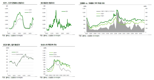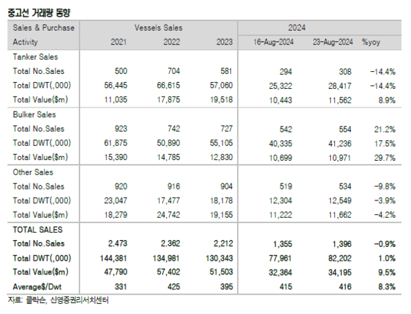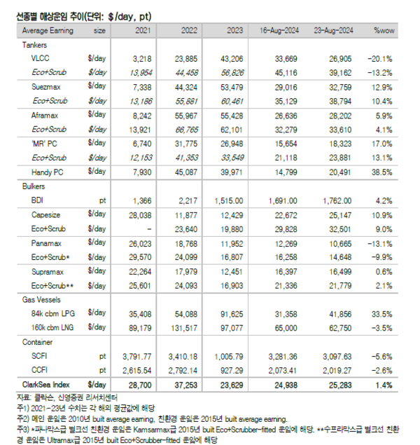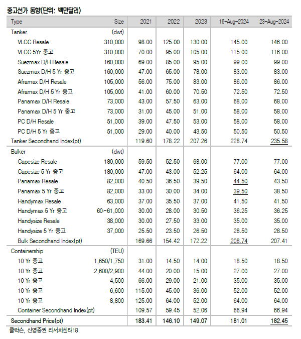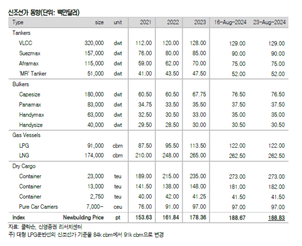 하계 휴가기간에도 신조선 발주는 꾸준했다. 지난 주 신조선가와 중고선가지수 모두 상승했다. 신영증권 엄경아 애널리스트에 따르면 2024년 34주차(8월 23일) 신조선가지수는 전주대비 0.16포인트 상승한 188.83p를 기록했다.