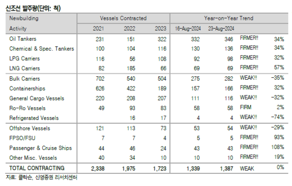 수주량은 오일탱커 14척, 케미칼 및 특수선 6척, LPG선 6척, 드라이벌크선 7척, 컨테이너선 9척, 제너럴카고선 5척, 해양지원선 1척 등 총 48척을 기록했다. 34주차 누적수주량은 1,387척이며, 전년동기 누적수주량은 1,011척이었다.