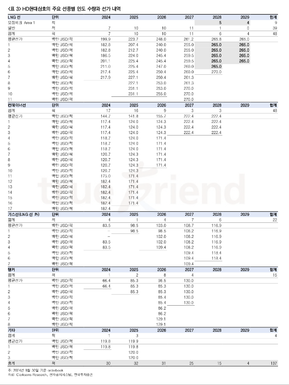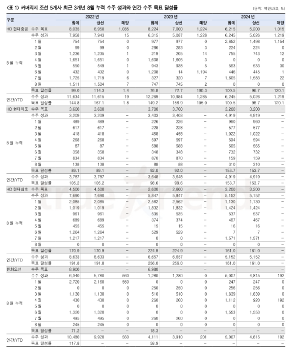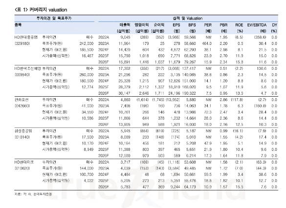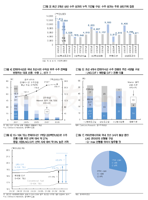 선사들이 원하는 2027년 납기 슬롯을 다량 제공할 수 있는 한화오션이 이번 투자로 가장 큰 수혜를 보게 됐으며 삼성중공업, HD현대중공업, HD현대삼호 모두 정식 계약 예정인 컨테이너선 프로젝트를 확보 중이다. 지난 7월 CMA-CGM이 발주한 LNG D/F 사양 1만5500TEU급 선가(222백만달러/척)를 기준으로 두면, 올해 말까지 컨테이너선으로만 커버리지 합산 50억달러 이상의 수주가 기대된다.