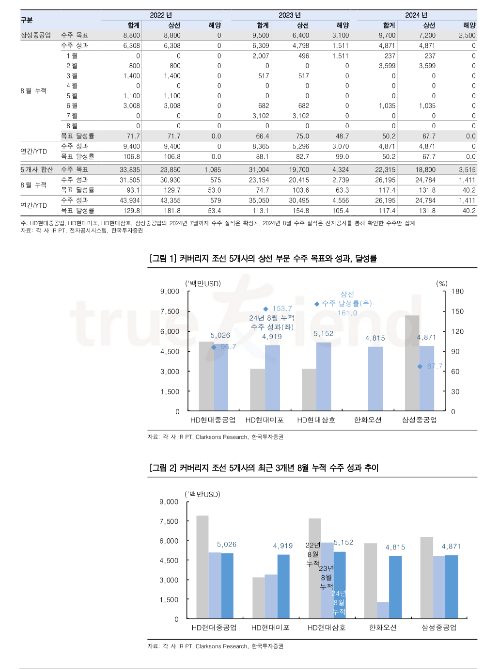 HD현대미포의 45k MGC 4척을 제외하면 대형선 전문 조선사들의 8월 상선 수주 실적은 전무했다. 수주 성과가 상반기에 비해 눈에 띄게 감소한 것이다. 이에 수주잔량이 상대적으로 가벼운 조선사를 중심으로 미래 상선 매출이 감소할 것이라는 우려가 제기됐지만 두가지 프로젝트에 힘입어 걱정은 단번에 해소됐다. 3분기 들어 주춤했던 상선 수주는 9월부터 다시 회복세로 접어들게 된다.