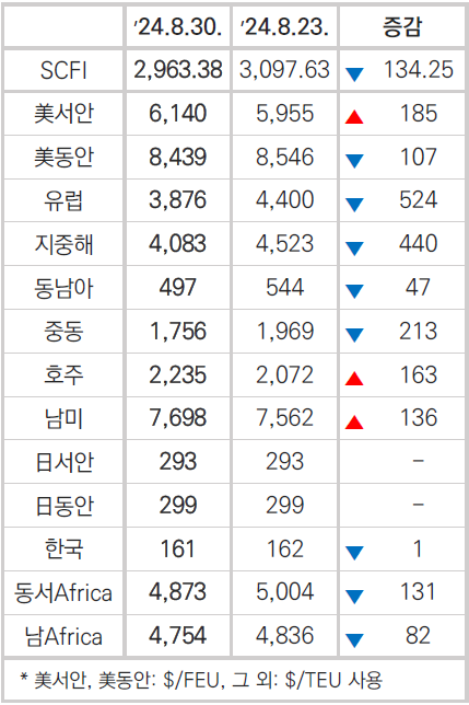 컨테이너 정기선 시황을 보면 SCFI(상하이발컨운임지수)는 2963.38p로 전주대비 4.33% 하락했고, KCCI(한국형 컨테이너운임지수)는 4467p로 1.4% 내렸다.