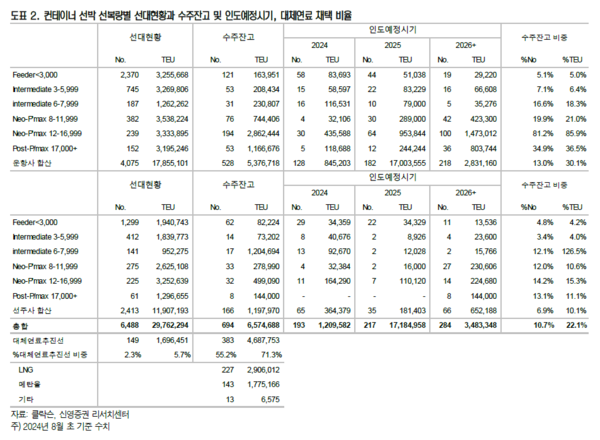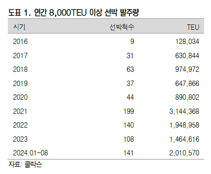 조선업은 투자와 관망을 동시에, 수주여력은 충분하다는 지적이다. 신영증권 엄경아 애널리스트에 따르면 2024년 갑작스런 컨테이너선 시리즈 발주에 투자자들이 의아함을 감추지 못하고 있다. 8,000TEU급 이상의 컨테이너선이 지난 8개월간 141척 발주됐다. 2022년이나 2023년 대비 많은 척수에 해당되며, 선복량기준으로도 2021년을 제외하고 최대수준에 해당된다.