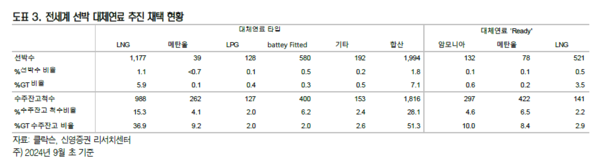 6만척이 넘는 화물운송선 중 대체연료 추진이 가능한 선박의 비중은 총톤수기준으로 7.1%이다. 이는 이중연료 추진엔진이 기본사양으로 탑재된 가스선이 포함된 수치이며, 일반상선에서는 매우 낮은 비율이다. 대형선 중심의 연료추진 전환에 필요한 시간이 10년 가까이 걸릴 것이라는 것을 감안하면, 조선업체들에 대한 신규 수주 피크아웃 우려는 과도하다고 판단.