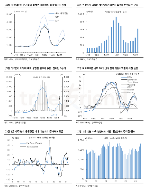 SCFI와 다르게 HMM의 이익 모멘텀은 하반기가 더 본격적이라는 지적이다. 내년에는 다시 올해 이익 서프라이즈에 따른 기저부담과 단기 공급과잉이 우려되지만, 그때면 현금성 자산이 15조원에 달할 전망이다. 순차입금이 현재 시총과 비슷해서 홍해 사태 수혜가 사라져도 2025F EV/EBITDA는 1배 수준이다고 최 애널리스트는 밝혔다.