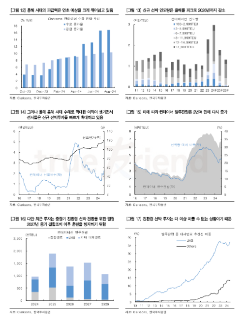 컨테이너 해운업계는 팬데믹 물류대란에 이어 올해 홍해 사태 수혜로 막대한 이익을 손에 쥐면서 신규 투자를 다시 확대하고 있다. 지난 2년여 동안 감소해 왔던 발주잔량은 6월부터 증가하기 시작했다. 특히 지금까지는 선복량 확대에 소극적이었던 머스크가 50척이 넘는 선박투자를 예고하며 뒤늦게 LNG 추진선 발주 트렌드에 합류하는 모습이다.