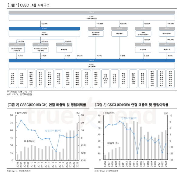 거대 조선그룹인 CSSC는 자회사 합산 수주잔량 기준 전세계 점유율 1위 조선사이다. 전체 수주잔량의 64.7%를 컨테이너선, 탱커, 벌크선이 차지한다.