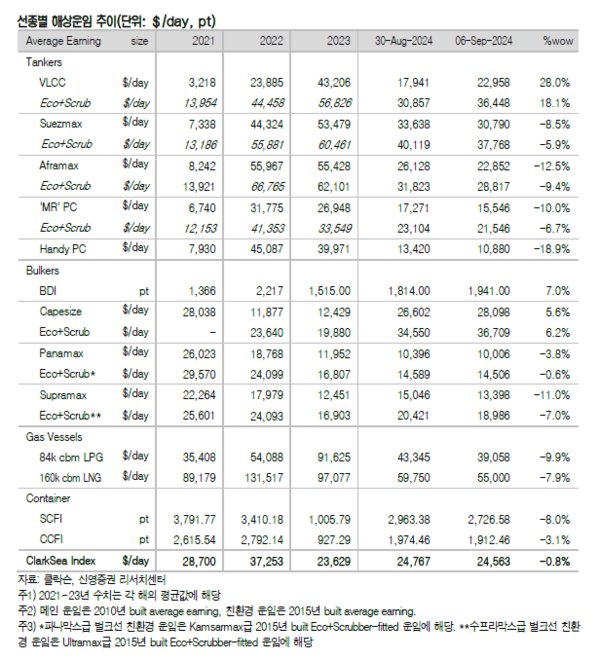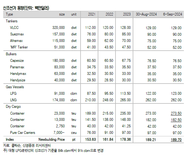 신영증권 엄경아 애널리스트에 따르면 2024년 36주차(9월 6일) 신조선가지수는 전주대비 0.49포인트 상승한 189.7p를 기록했다. 선종별 상세선가를 보면 컨테이너선 중 23,000TEU급 은 50만달러 상승했고 ,13,000TEU급도 50만달러 올랐다.