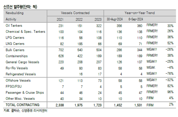 수주량은 오일탱커 4척, 케미칼 및 특수선 2척, LNG선 2척, 드라이벌크선 58척, 제너럴카고선 11척, 부유식 해양저장선 2척 등 총 79척을 기록했다. 36주차 누적수주량은 1,531척이며, 전년동기 누적수주량은 1,071척이었다.