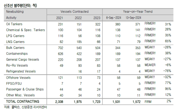 수주량은 오일탱커가 11척, 케미칼 및 특수선 3척, LPG선 2척, LNG선 8척, 드라이벌크선 9척, 컨테이너선 5척, 해양지원선 1척, 여객선 및 크루즈 1척, 기타 선박 1척 등 총 41척을 기록했다. 37주차 누적수주량은 1,572척이며, 전년동기 누적수주량은 1,106척이었다.
