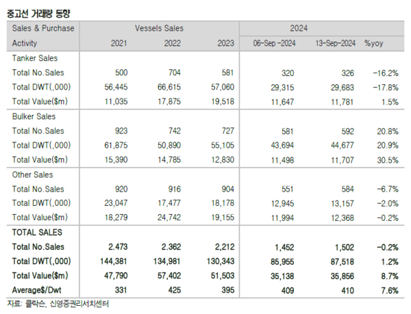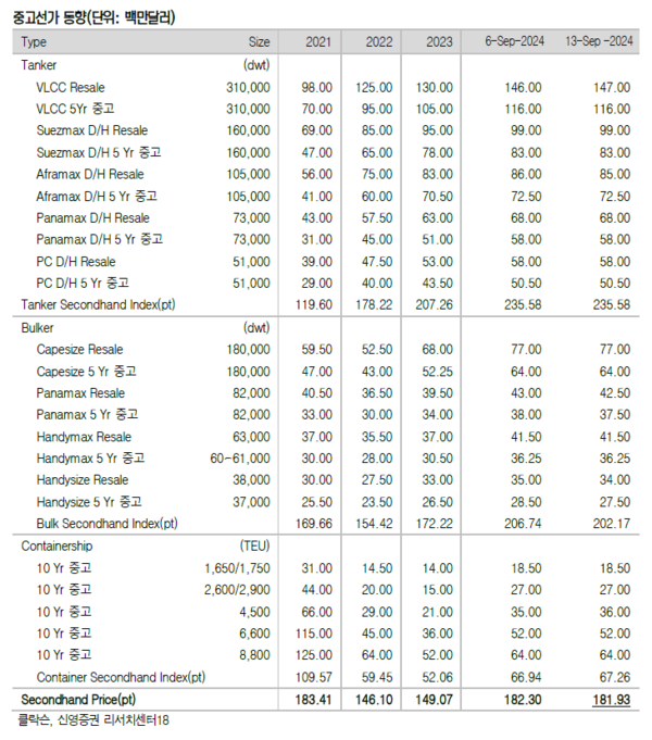 신조선 발주 척수가 중고선 매매량을 앞섰다. 37주차(9월 13일) 신조선가지수는 상승했고 중고선가지수는 하락했다. 신영증권 엄경아 애널리스트에 따르면 2024년 37주차(9월 13일) 신조선가지수는 전주대비 0.07포인트 상승한 189.77p를 기록했다.