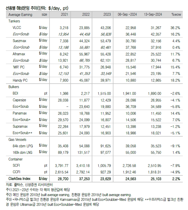 지난주(9/13) 탱커 평균운임은 VLCC가 36.2% 상승한 31,267달러, 수에즈막스는 4.4% 오른 32,156달러, 아프라막스는 11.7% 상승한 25,522달러, MR은 15.4% 상승한 17,944달러를 기록했다. 핸디사이즈는 18.2% 오른 12,865달러를 기록한 것으로 나타났다.