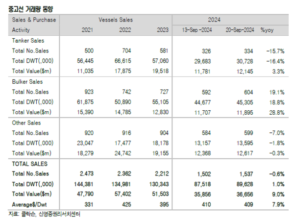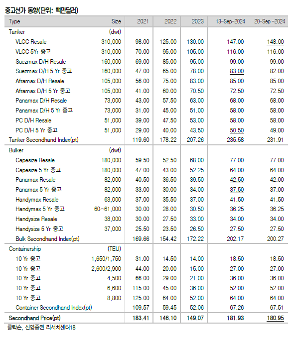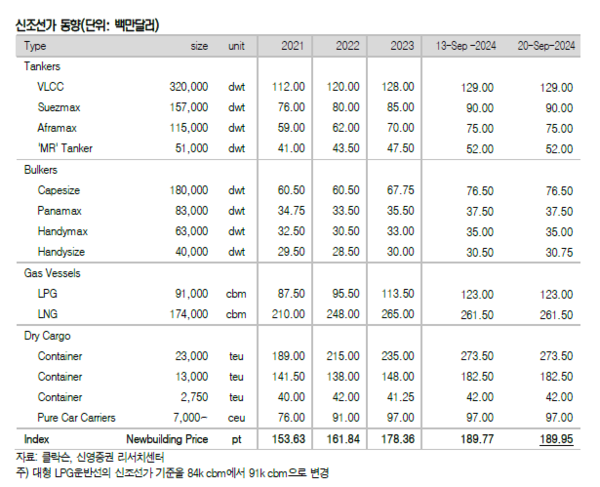 신조선 발주시장의 활기가 꺾이지 않고 있다. 지난 주 신조선가지수는 상승했고 중고선가지수는 하락했다. 신영증권 엄경아 애널리스트에 따르면 2024년 38주차(9월 20일) 신조선가지수는 전주대비 0.18포인트 상승한 189.95p를 기록했다.