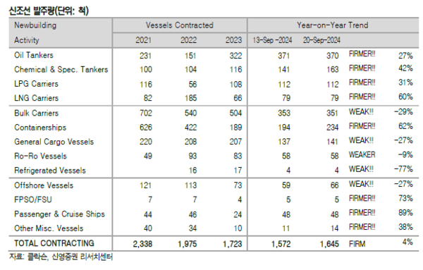 선종별 상세선가는 벌크선 중 핸디사이즈급이 25만달러 상승했다. 수주량은 케미칼 및 특수선 22척, 컨테이너선 40척, 제너럴카고선 4척, 해양지원선 7척, 기타선박 3척 등 총 76척을 기록했다. 오일탱커 1척 취소와 드라이벌크선 2척 취소가 있었다. 38주차 누적수주량은 1,645척이며, 전년동기 누적수주량은 1,137척이었다.