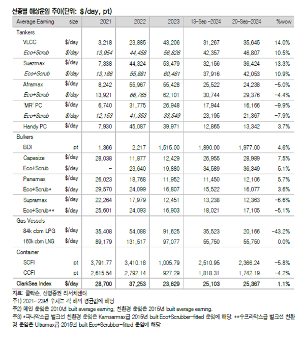 지난주(9/20) 탱커 평균운임은 VLCC가 14.0% 상승한 35,645달러, 수에즈막스는 13.3% 상승한 36,424달러, 아프라막스는 5.0% 하락한 24,238달러, MR은 9.9% 하락한 16,166달러를 각각 기록했고 핸디사이즈는 3.7% 상승한 13,342달러를 기록한 것으로 집계됐다.