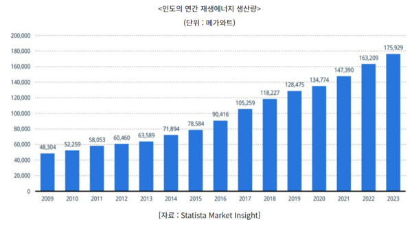 신재생에너지 관련 관세인하는 앞서 언급된 관세 인하 품목과 유사하게 자국 내 제조업 육성을 위한 조치의 일환으로 해석 가능하다. 인도는 2024년 재생에너지 생산 용량 세계 4위이며, 그 중 태양광에너지 비중이 가장 높다. 이번 관세 인하로 태양광 전지, 태양광 모듈 생산을 위한 생산설비 기반을 확보하여 자국 내 태양광 산업을 더욱 육성하려는 의도로 보인다.