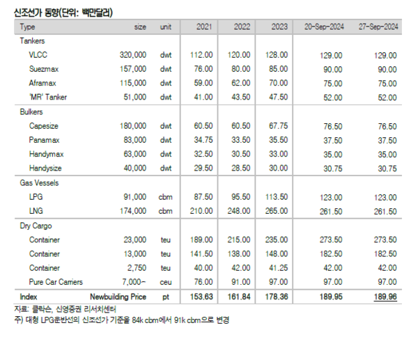 2024년 39주차(9월 27일) 신조선가지수는 전주대비 0.01포인트 상승한 189.96p를 기록했다. 선종별 상세선가는 변동이 없었다.