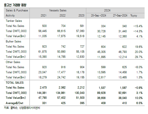 39주차 중고선 거래량은 50척을 기록했다. 누적기준으로는 1,587척이 거래됐으며, 전년동기는 1,601척을 기록했다.