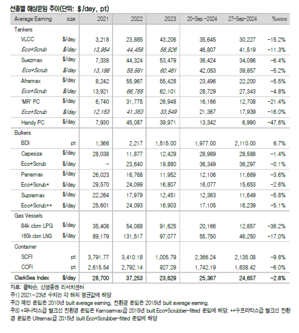 한편 건화물선운임지수 BDI는 2000p를 상회했고 타선종 해상운임은 모두 약세를 시현했다.