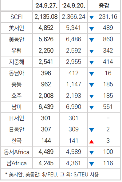 - 컨선 시황 ‘SCFI 하락 진정세, 주요 항로 하락은 지속’, 드라이벌크선 ‘연이은 중국 부양책에도 반응 미온적’