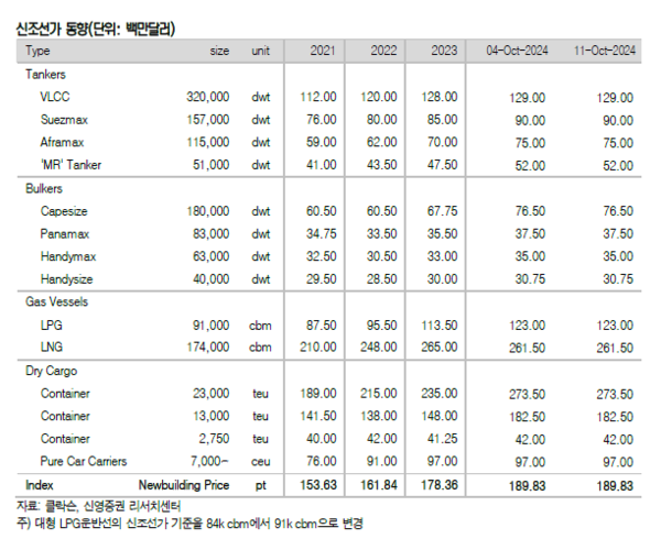 신조선가 하락추세가 나타나지 않고 있다. 지난 주 신조선가지수는 전주와 동일했고 중고선가지수는 하락했다. 신영증권 엄경아 애널리스트에 따르면 2024년 41주차(10월 11일) 신조선가지수는 전주와 동일한 189.83p를 기록했다. 선종별 상세선가도 변동이 없었다.