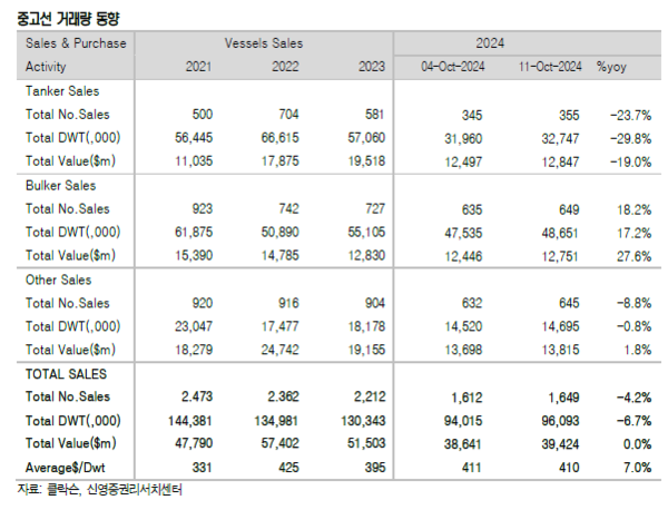 41주차 중고선 거래량은 37척을 기록했다. 누적기준으로는 1,649척 거래됐으며, 2023년 동일기간은 1,721척을 기록했었다.