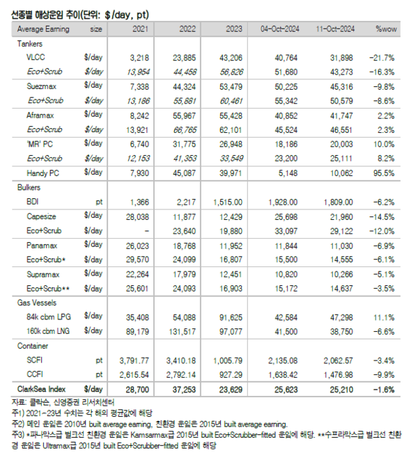 10월 11일 탱커 평균운임은 VLCC가 21.7% 하락한 31,898달러, 수에즈막스는 9.8% 내린 45,316달러, 아프라막스는 2.2% 상승한 41,747달러, MR은 10.0% 오은 20,003달러를 기록했고 핸디사이즈는 95.5% 오른 10,062달러를 기록했다.