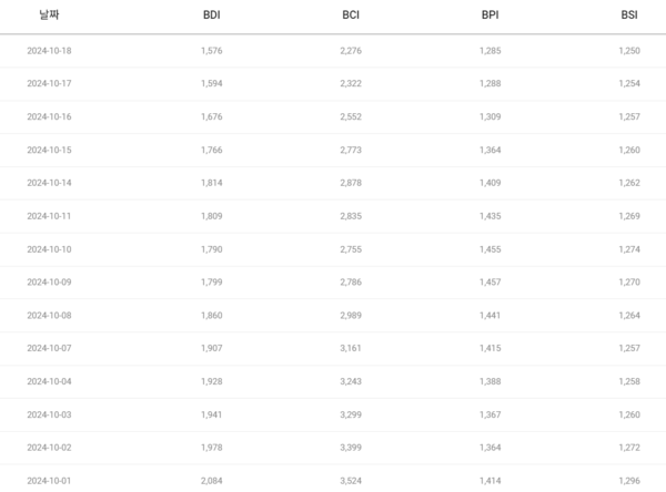 한편 건화물선운임지수 BDI는 18일(금) 1576p를 기록해 14일(월) 1814p보다 큰폭 하락했다. 10월 1일 BDI는 2000p를 넘은 2084p였다. 18일 BDI는 1일 대비 24.4%나 급락한 셈이다.