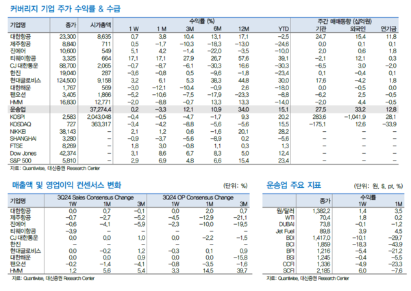 대신증권 커버리지 중 주간 수익률 상위 기업은 티웨이항공 17.1%, 진에어 5.1%, 현대글로비스 3.2% 순