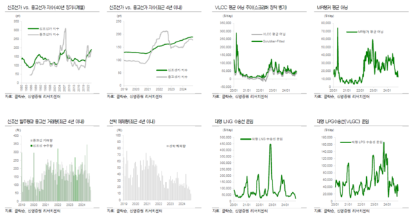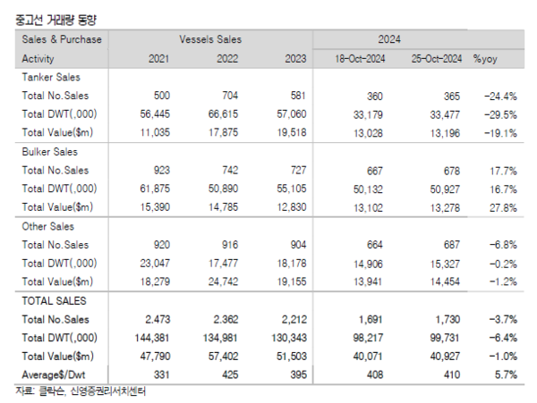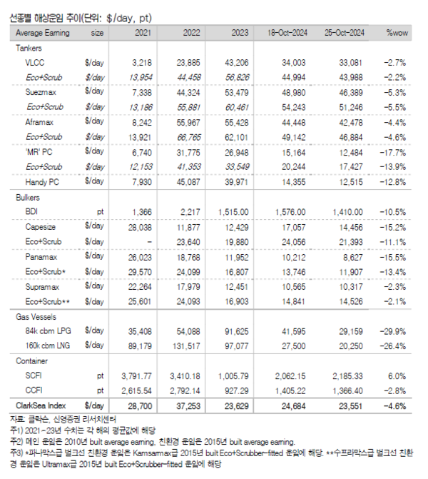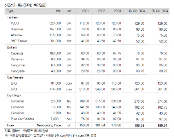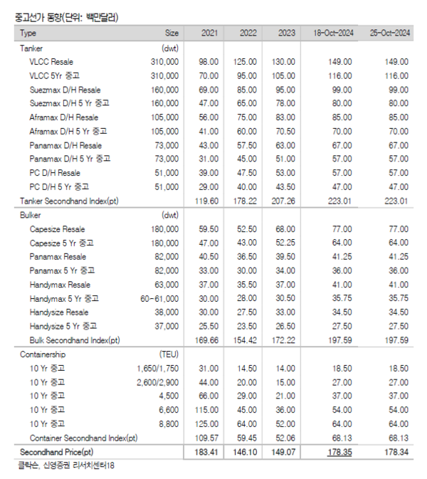 지난 주 컨테이너선 선가는 상승했고 선가지수는 하락했다. 신조선가지수와 중고선가지수 모두 내렸다. SCFI는 반등했고 BDI는 약세를 보였다. 신영증권 엄경아 애널리스트에 따르면 2024년 43주자(10월 25일) 신조선가지수는 전주대비 0.04포인트 하락한 189.64P를 기록했다. 선종별 상세선가를 보면 컨테이너선 중 2만3000TEU급은 50만달러 상승했고 1만3000TEU급은 25만달러 올랐으며, 2750TEU급은 1백만달러 상승한 것으로 나타났다.
