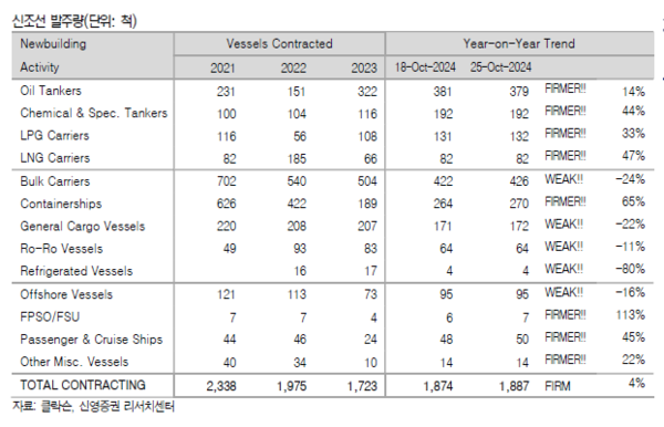 수주량은 LPG선 1척, 드라이벌크선 4척, 컨테이너선 6척, 제너럴카고선 1척, 부유식 생산설비 1기, 여객선 및 크루즈 2척 등 총 15척을 기록했다. 43주차 누적 수주량은 1887척이며 전년동기 누적수주량은 1320척이었다.