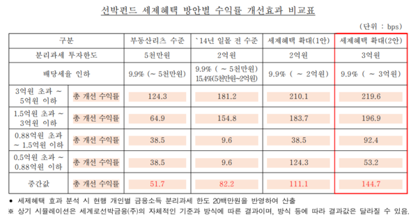 더욱이 선박금융시장에서는 해진공의 설립과 기능 확대로 후순위대출도 여타 산업의 후순위대출에 비해 대출이율이 비교적 저렴한 수준이다. 이러한 상황을 고려할 때 선박펀드의 세제혜택은 일몰 전보다 대폭 개선된 내용으로 복원되어야 한다. 동 세제혜택과 관련 세제혜택 방안별, 개인 소득수준별로 시뮬레이션을 해 본 결과, 일반 투자자들은 다음과 같이 투자수익률을 제고할 수 있는 것으로 확인되었다.