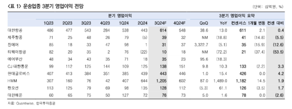 운송업종은 실적 개선은 기본이고 4분기 모멘텀도 터진다는 지적이다. 한국투자증권 최고운 애널리스트에 따르면 3분기 운송업종은 화물/물류 부문의 실적 개선이 두드러졌다. 대한항공, 현대글로비스, CJ대한통운, HMM은 컨센서스를 소폭 웃도는 영업이익이 예상된다.