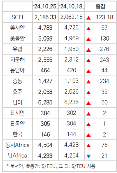 미주항로는 ILA파업과 철송지연에 따른 물류망 혼잡지속 및 10월 GRI적용으로 운임이 소폭상승하면서 강보합세를 유지했다. 전반적으로 수요증가와 공급제한 요인이 맞물려 운임상승을 이끌었다.