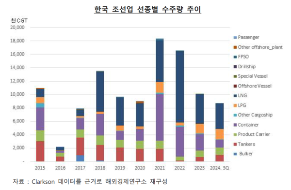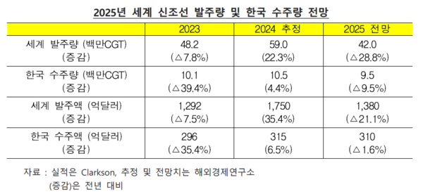 하지만 주력 선종의 수요 감소로 인해 '25년 국내 신조선 수주량은 전년대비 약 10% 감소한 950만CGT, 수주액은 약 2% 감소한 310억달러 수준이 될 것으로 전망된다.