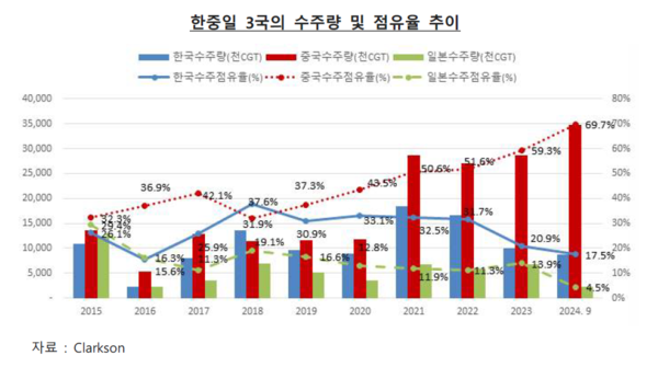 이러한 상황은 국내 조선업계가 LNG선과 LPG선 등 가스선 시장 외에 기존 우위를 유지하던 대형선 시장에서조차 경쟁력을 발휘하지 못하며 대부분의 수주를 중국 조선사에 내주고 있기 때문이다.