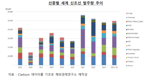 현재 양호한 시황을 보이고 있는 탱커와 LPG선 등은 '25년에도 양호한 시황을 유지할 것으로 예상되나 해운시장의 운임 하락에 대한 영향과 크게 증가한 '24년도 발주량에 대한 기저효과로 '25년 발주량은 '24년 수준에 미치지 못할 것으로 전망된다.