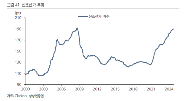 10월 25일 기준 클락슨 신조선가는 189.6pt로 역사적 최고점인 2008년 8월 191.6pt에 다다르고 있다. 공급 증가가 제한돼 있는 현 상황에서 신조선가의 추가 상승 여력을 판단하기 위해선 꾸준한 선박 발주 수요로 공급자 우위 시장이 유지될 수 있는 지 여부가 가장 중요하다.