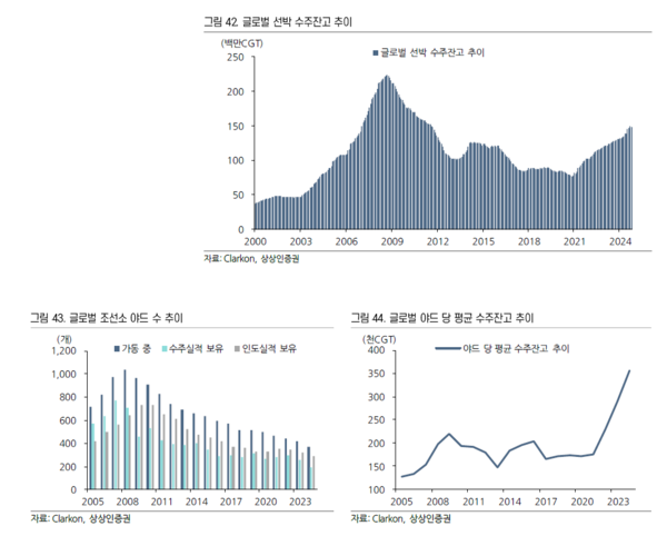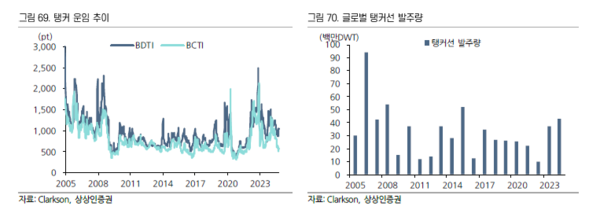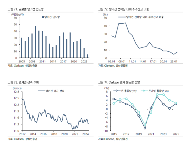 한편, 글로벌 탱커 물동량은 톤 기준 올해 +0.6% 증가하며 다소 약한 수요를 보여주고 있으나 2022년 이후 러우전쟁, 중동전쟁 등 지정학적 요인에 의해 선복 부족 현상이 발생하며 톤마일 수요는 +4.1% 증가했다. 전쟁이 장기간 지속될 경우 탱커선 발주 수요에는 긍정적일 것으로 기대하고 있다.