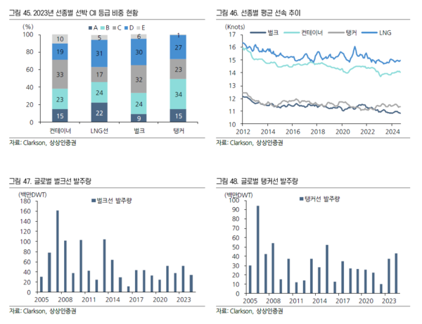 중장기적으로는 친환경 규제와 선박 교체 수요가 맞물리면서 선박 발주 증가를 견인할 수 있을 것으로 전망된다. 2018년 IMO(국제해사기구)는 탄소집약도를 2030년까지 40%, 2050년까지 70% 감축, 이산화탄소 및 온실가스를 2050년까지 50% 감축하는 저감 목표에 합의했다. 기존에는 엔진 사양을 기반으로 이론적 배출량을 산출해 선박이 환경에 미치는 영향도를 반영하는 EEDI 지수가 활용되고 있었으나, 2023년 IMO는 이를 기존 선박까지 확대한 EEXI 및 실제 1년간의 탄소 배출량을 고려해 선박을 A등급에서 E등급의 5구간으로 세분화하는 CII 기반 평가를 도입했다.