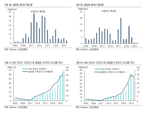 탱커선은 선속 감소 등의 방식으로 친환경 대응이 이뤄지는 경우가 많아 빠른 노후선 교체가 이뤄지기 어렵다. 또한, 그동안 친환경 연료 전환 노선이 불분명해 선사들이 신조 발주를 미뤄왔을 것으로 추측하며, 이러한 부분들 때문에 교체시기 도래했음에도 불구하고 대량 발주로 이어지지 못했다. 실질적인 환경 규제가 여전히 미흡하다는 점은 아쉬운 부분이나, 전환 연료의 노선이 점차 가시화됨에 따라 교체가 활발해질 수 있다는 점을 고려했을 때 신조 발주가 본격적으로 증가할 가능성이 있다.