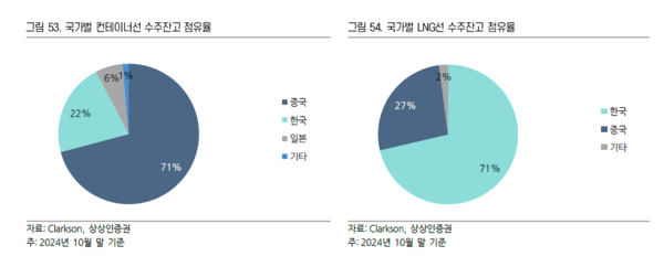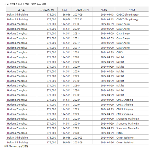 LNG선은 건조 난이도가 높아 한국 조선사들의 수주 점유율이 높은 선종이나, 후동중화 조선, 대련조선 등 중국 조선사들도 LNG 레퍼런스를 쌓아가고 있다. 이를 통해 중국 조선소의 건조 기간 및 품질이 개선된다면 중장기적으로 중국 LNG 수주 점유율이 상승할 수 있음을 유의할 필요가 있다. 그러나 현재로선 중국 조선사의 LNG 수주는 주로 중국 선사들 위주이며 향후 LNG 생산 프로젝트는 미국 등 한국 우방국 비중이 높다는 점을 감안했을 때 한국 LNG 수주에 미칠 영향은 제한적일 것으로 예상하고 있다.