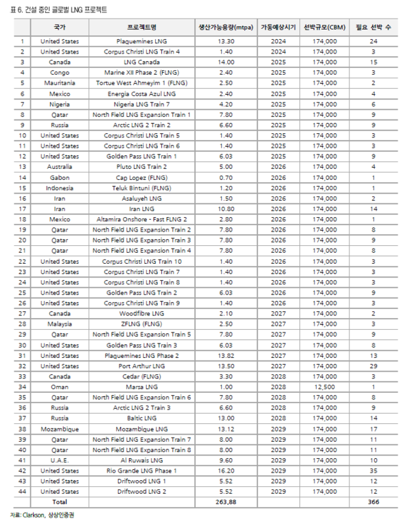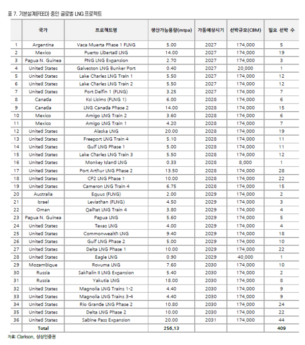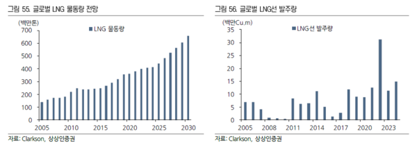 친환경 에너지 전환 니즈 및 러우전쟁에 의한 PNG 수입 중단에 따라 LNG 수요는 빠르게 증가 중이다. 이에 따라 미국, 카타르 등 주요 LNG 생산국은 대규모 생산 프로젝트 건설을 계획하고 있다. 클락슨은 LNG 수요와 공급이 동시에 급증하면서 글로벌 LNG 물동량도 2025년부터 2030년까지 연평균 7.7% 성장률로 빠르게 증가할 것으로 전망하고 있다.